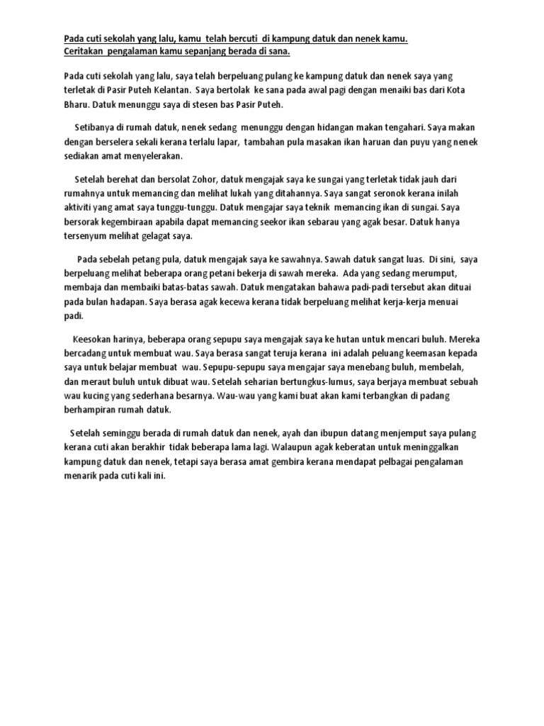 Pada cuti sekolah yang lalu kamu telah bercuti di kampung datuk dan nenek kamu. Pengalaman Bercuti Di Kampung Datuk Pada cuti sekolah yang lalu ayah membawa kami sekeluarga melawat ke kampung datuk. RASAI PENGALAMAN MENARIK DI KG.