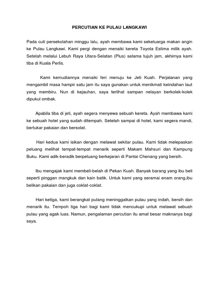 Human translations with examples. My essay goes on vacation in the island of langkawi. Contoh karangan bi bercuti di pulau langkawi.